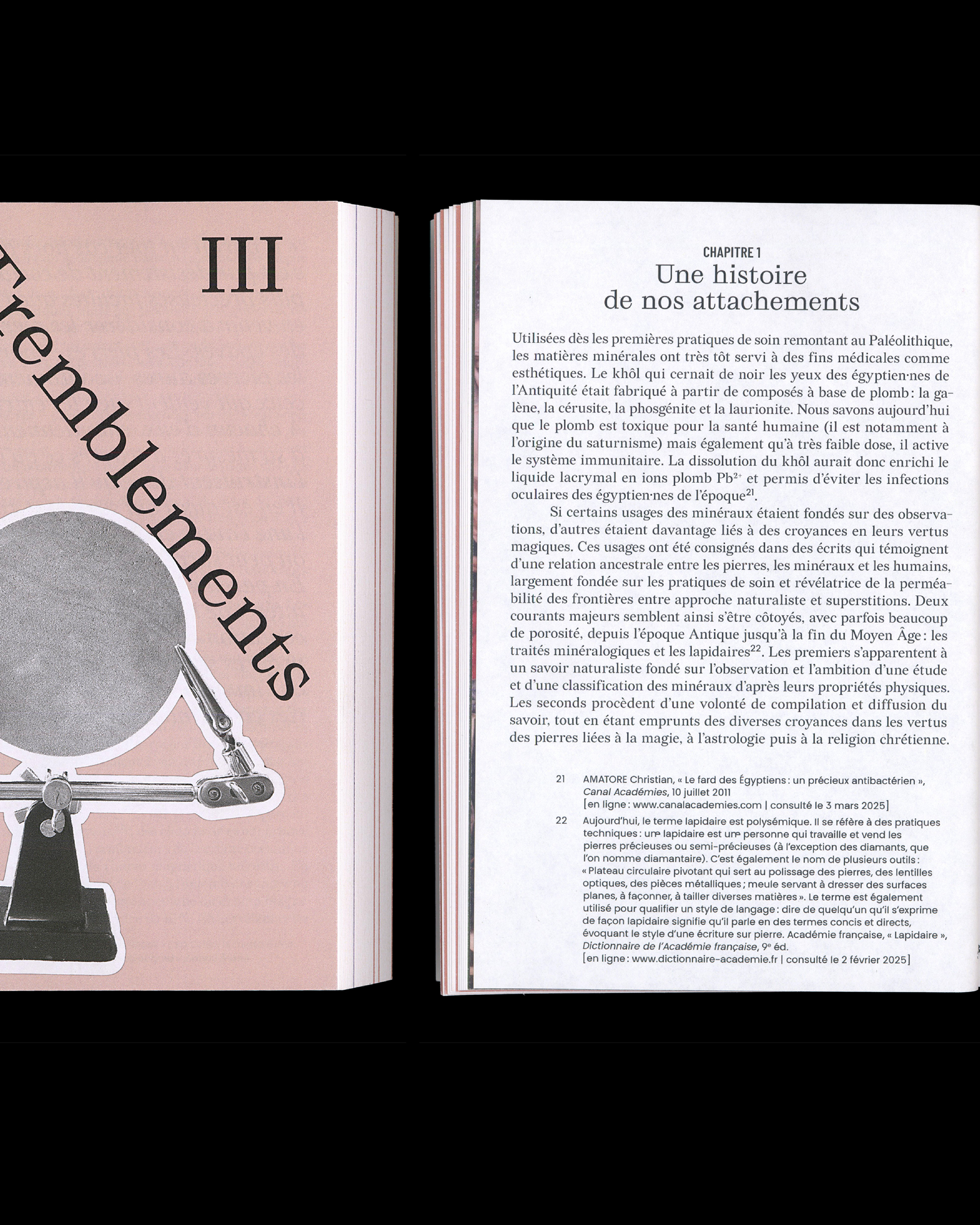 Quand et pourquoi l’Occident a-t-il fait mourir les pierres ? C’est par cette double question que s’ouvre ce travail de recherche consacré aux liens – matériels, symboliques, sensibles – qui unissent les corps géologiques et les corps humains. Sommes-nous vraiment - les pierres, les minéraux et nous, humains - aussi radicalement différent·es que nous l’ont enseigné·es nos professeur·es du cours élémentaire ?